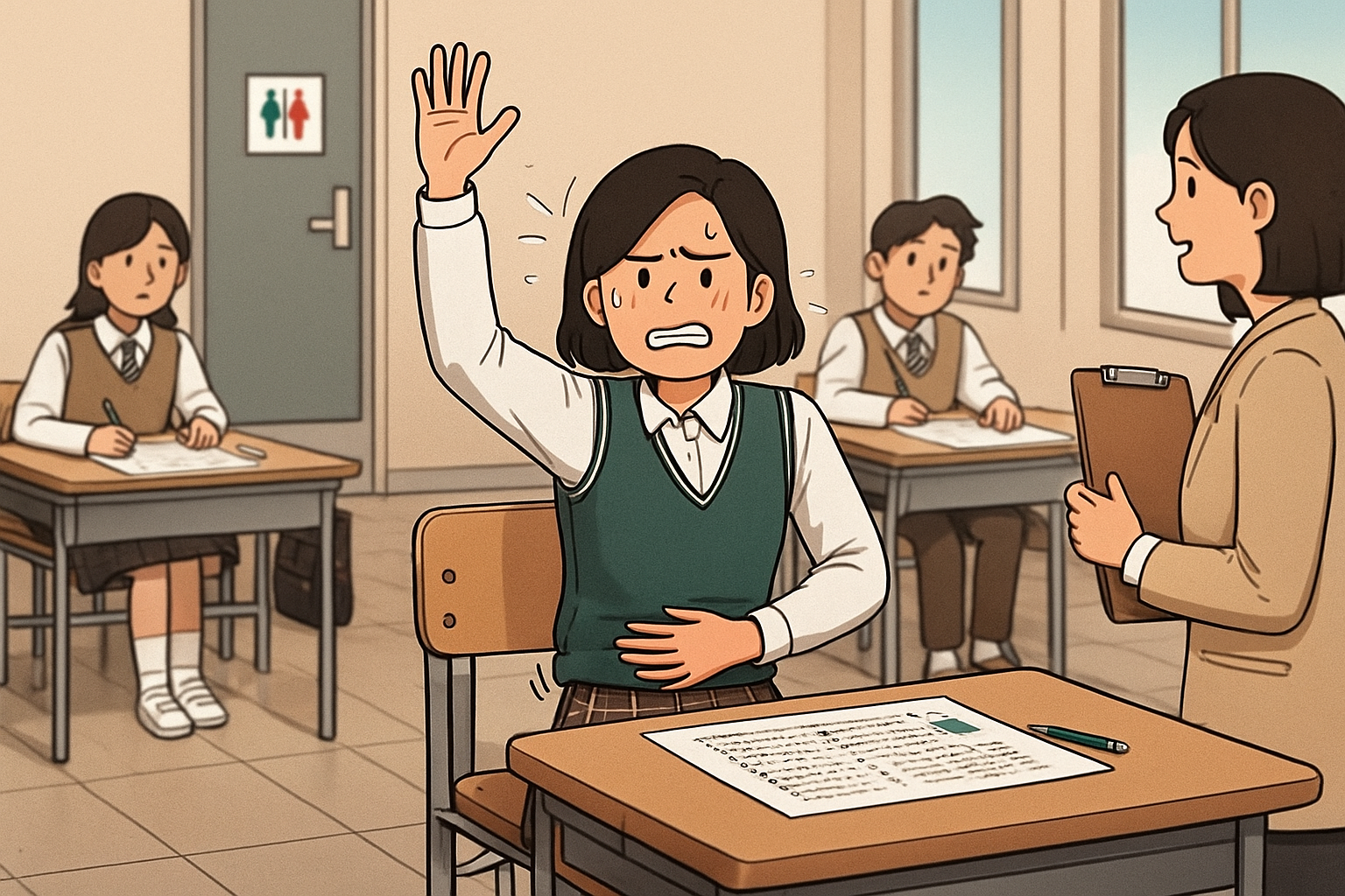 6. 시험 중 화장실이 가고 싶은 꿈, 시험보다 화장실이 더 급한 꿈, 시험을 보다가 화장실을 찾는 꿈, 시험장 안에서 용변을 참는 꿈, 시험 시간 중 화장실 때문에 마음이 조급한 꿈.