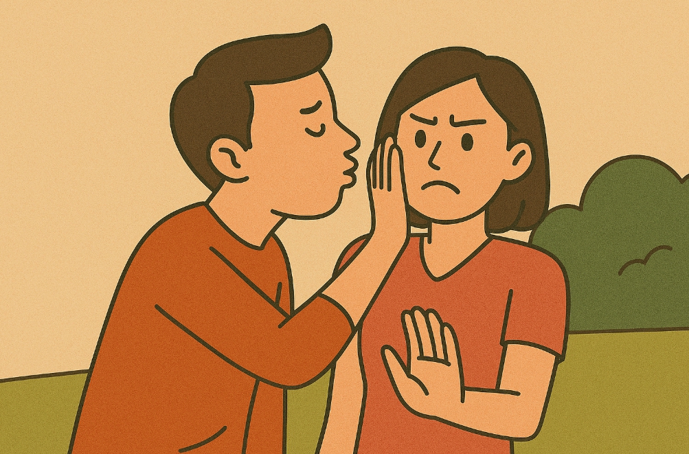 마음이 따라주지 않는데 억지로 키스를 하는 장면은, 현실에서 내 의지와 상관없이 어떤 선택이나 관계를 떠맡고 있는 상황을 반영하기 쉽습니다. 표정과 속마음은 ‘싫다’고 말하고 있지만, 분위기·압박·기대 때문에 거절하지 못하고 있는 내 모습을 상징적으로 보여 줍니다. 이런 꿈은 특히 ‘좋은 사람’으로 보이기 위해 내 경계를 계속 양보할 때 자주 나타납니다. 꿈은 나 자신의 동의와 편안함이 없는 관계나 상황에서는, 더 늦기 전에 분명한 선을 긋는 용기가 필요하다는 메시지를 전하고 있습니다.